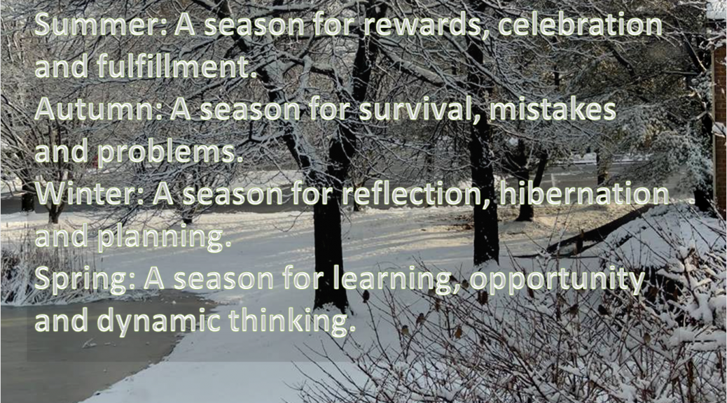Like plants, we also go through various types of seasons in our lives. We have our own seasons!. Having a full -time job and growing economy-are like spring and summer seasons where we find opportunities everywhere. We tap into various opportunities and would like to grow in career and make a better life. There is nothing wrong in this. If the economy is taking a recession then it is like winter and we will be cautious about our needs and spending as the world around exhibit lesser activity. In other words, when there is flow of surplus money we rush to buy things – more clothes, shoes, changing cars, buying houses etc. We expand our social circle and try to fit into or lead someone else life. In the process, we forget what reality is and to ground ourselves. We tend to ignore the fact that we may also face harsh situations (winter) in our lives. It is important to be prepared for all seasons of life while living (grounded) in the present.