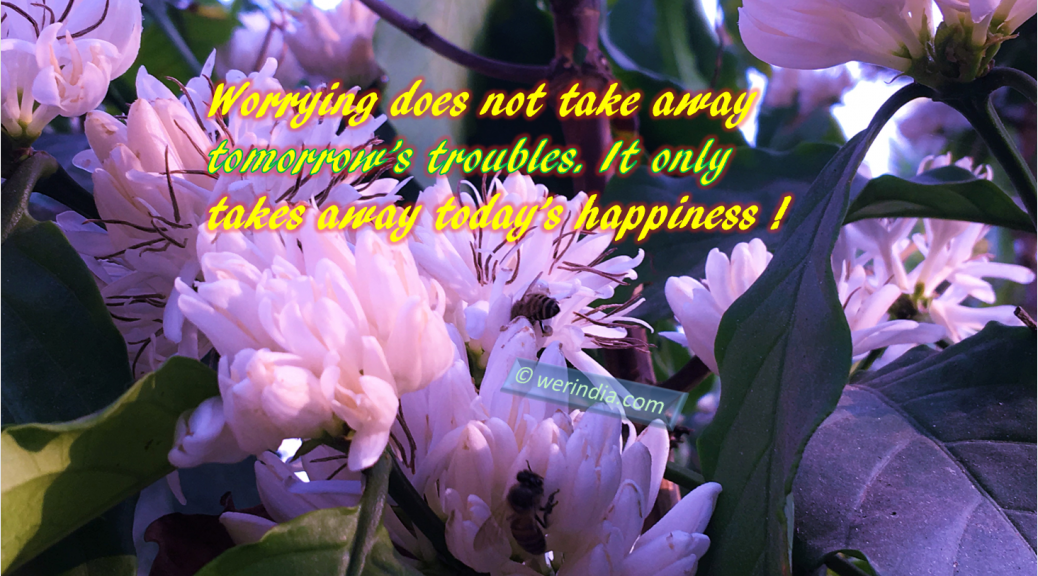 Life’s philosophy is whatever happens, happens for the best. Worrying about something, which is not in our control, is not going to solve our problems. Sometimes problem may not even exits. It may be our imagination. Kill that unnecessary worry by thinking “what did you gain by worrying”? If your answer is nothing- then, stop worrying today itself and start living!