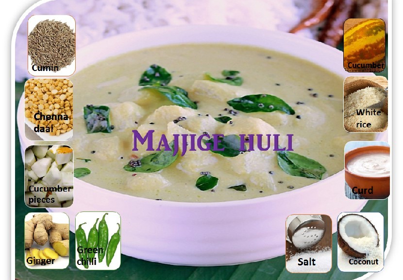 Majjige huli or Mor kuzhambu / majjige pulusu is a popular, tasty and traditional dish of Karnataka, India. Vegetables of Cucumber family (cucurbitaceae) are used for this dish. Particularly, cucumber, ash gourd, chayote, ivy gourd can be used to prepare this dish that needs thick buttermilk or curd/yogurt.
