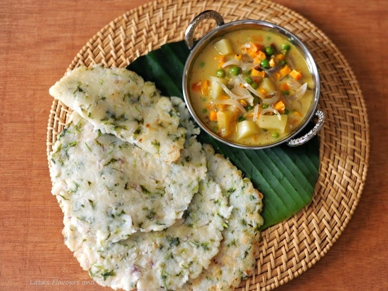 Akki Rotti is a rice-based breakfast item unique to the state of Karnataka, India but extremely popular. Akki-Rotti means rice-bread in the native language, Kannada. It is made of rice flour which is mixed with salt and water and kneaded well to make a soft dough. Sliced onions and chilies, curry leaves, chopped coriander and cumin seeds are added while kneading the dough. Oil is spread over a griddle (tava and a small amount of the dough is stretched to a thin sheet to cover the entire griddle (rotti). A small amount of oil is spread over it and the griddle is placed over heat till the rotti turns golden brown. Akki Rotti is served hot and is eaten along with chutney. A dash of fresh butter or ghee with Akki Rotti is also preferred. In some parts along with butter, ghee people use molasses and coconut chutney on side for the taste. Traditionally women use banana leaves to spread akki rotti and will transfer to a tava on a clay oven.